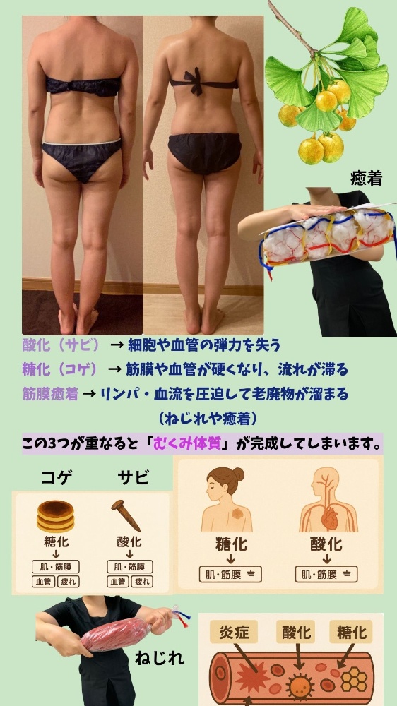 それらを生む、筋膜の癒着を解放し、溜まった毒素を出す、リンパ節・筋膜・筋肉・排泄すべての要素が集まった施術です。
