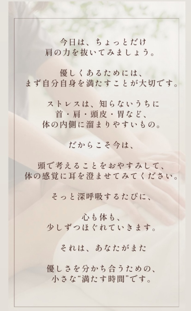 今日は“がんばる私”を、ちょっとお休みして。“感覚゙心地よい私”に、そっとゆだねてくださいね。頭も心も、もう十分によくやってきました。言葉で伝えることばかり頑張らなくても、あなたの優しさや存在は、すでに伝わっています。今は、言葉の世界をひと休みして、体と感覚で“安心”を味わってください。それが、あなたをいちばん深く癒す時間になります🌸
